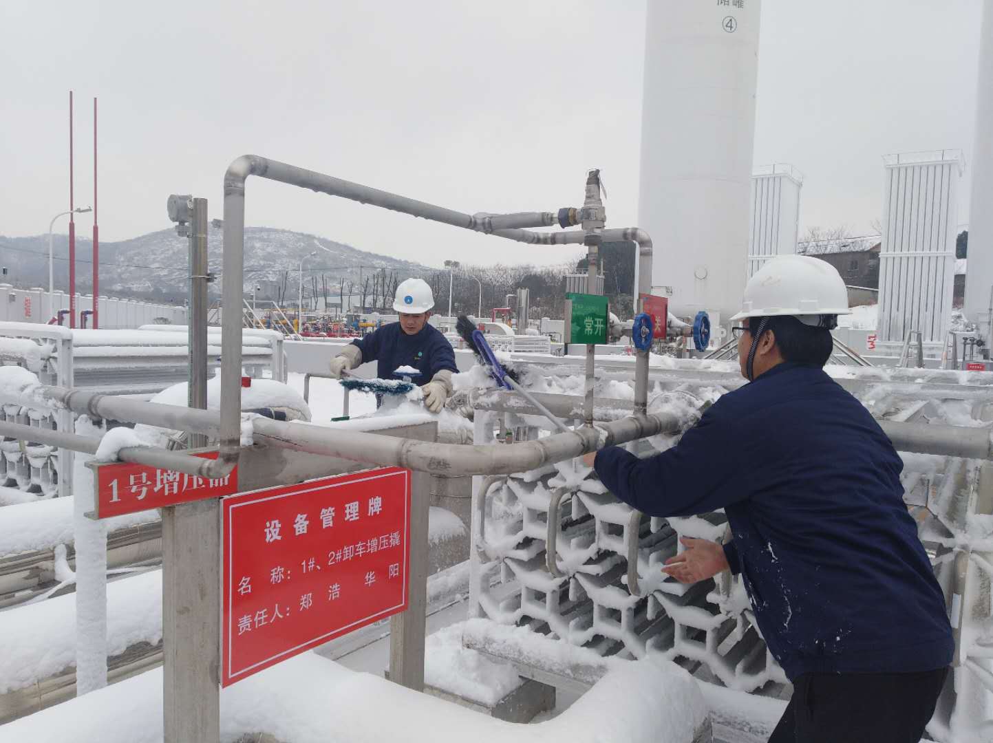 隨著低溫天氣持續(xù),我市城區(qū)日用氣量逐日攀升,12月30日已達40萬立方左右。除21萬方管輸氣外,其它氣源均需安慶港華高價購進LNG(液化天然氣)并通過北部新城LNG應(yīng)急調(diào)峰站不間斷氣化補充。而本次降雪恰逢元旦假期,受高速限行?;泛蛧?、省道積雪等不利因素影響,有2/3的運送LNG來宜的罐車被迫滯留途中。面對多重挑戰(zhàn),安慶港華沉著應(yīng)對,一方面多方聯(lián)系附近氣源供應(yīng)商,不惜成本保供應(yīng);另一方面晝夜不間斷清掃站前及站內(nèi)車用通道,確保運氣罐車進出暢通,并及時清除關(guān)鍵設(shè)施操作閥門(緊急切斷閥、手動低溫閥)上的積雪,確保高負荷作業(yè)情況下各制氣相關(guān)設(shè)施高效運行。
