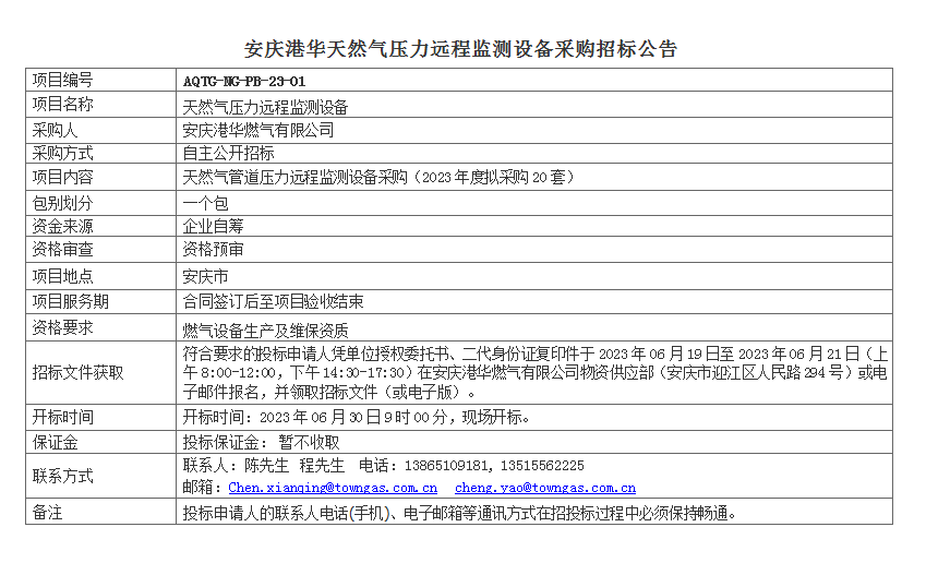 安慶港華天然氣壓力遠(yuǎn)程監(jiān)測設(shè)備采購招標(biāo)公告