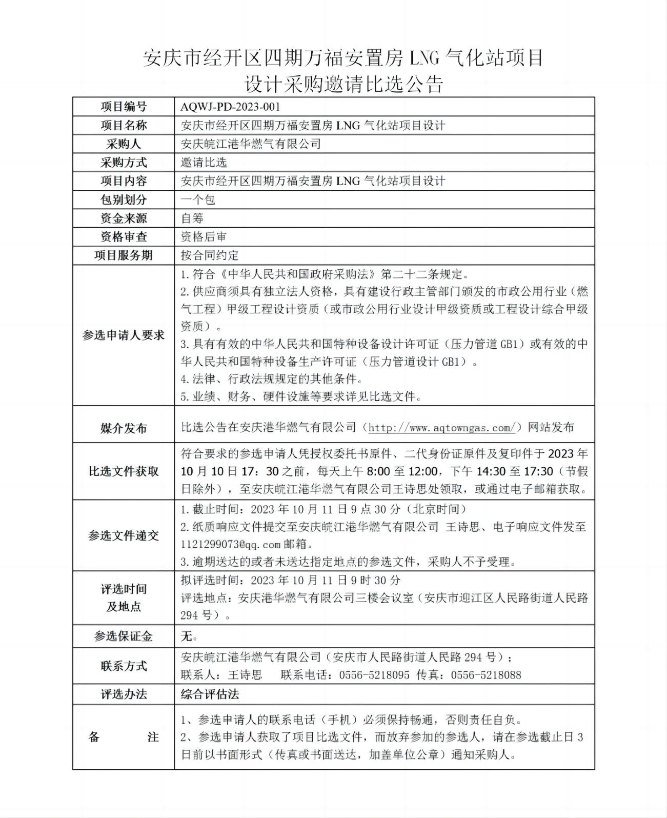 安慶市經(jīng)開區(qū)四期萬福安置房LNG氣化站項(xiàng)目 設(shè)計(jì)采購邀請(qǐng)比選公告