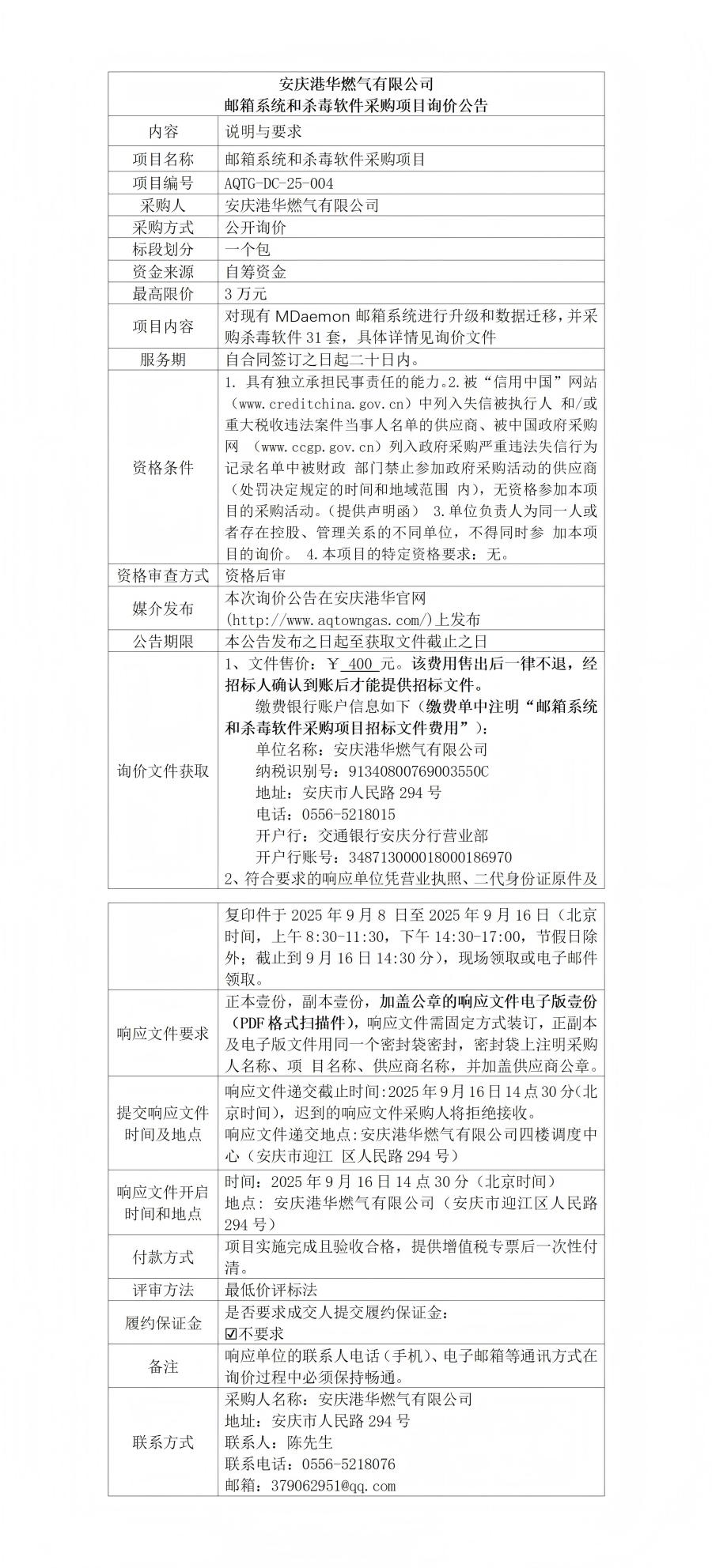 安慶港華燃?xì)庥邢薰距]箱系統(tǒng)和殺毒軟件采購項(xiàng)目詢價公告