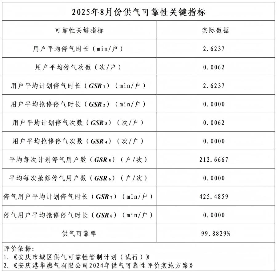 2025年8月份供氣可靠性關(guān)鍵指標(biāo)