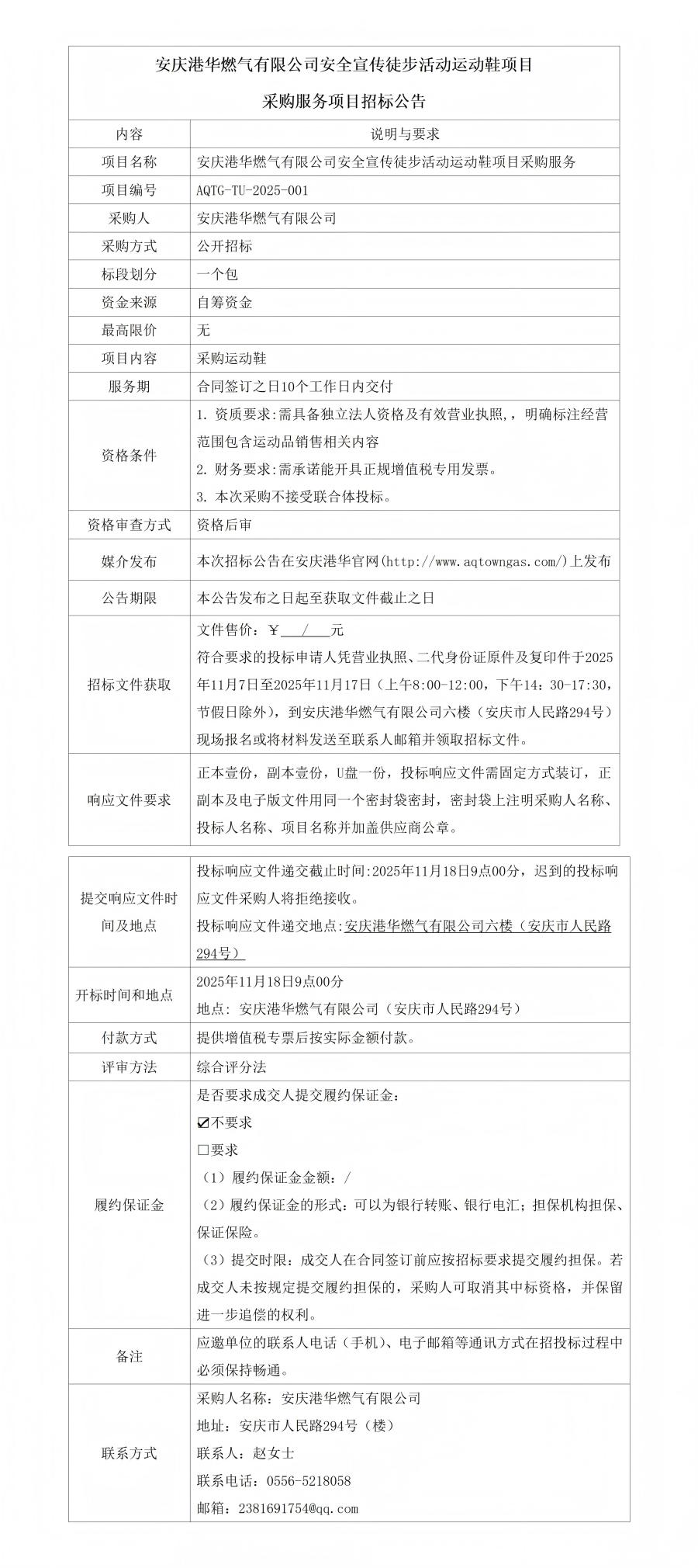 安慶港華燃氣有限公司安全宣傳徒步活動運動鞋項目采購服務項目招標公告