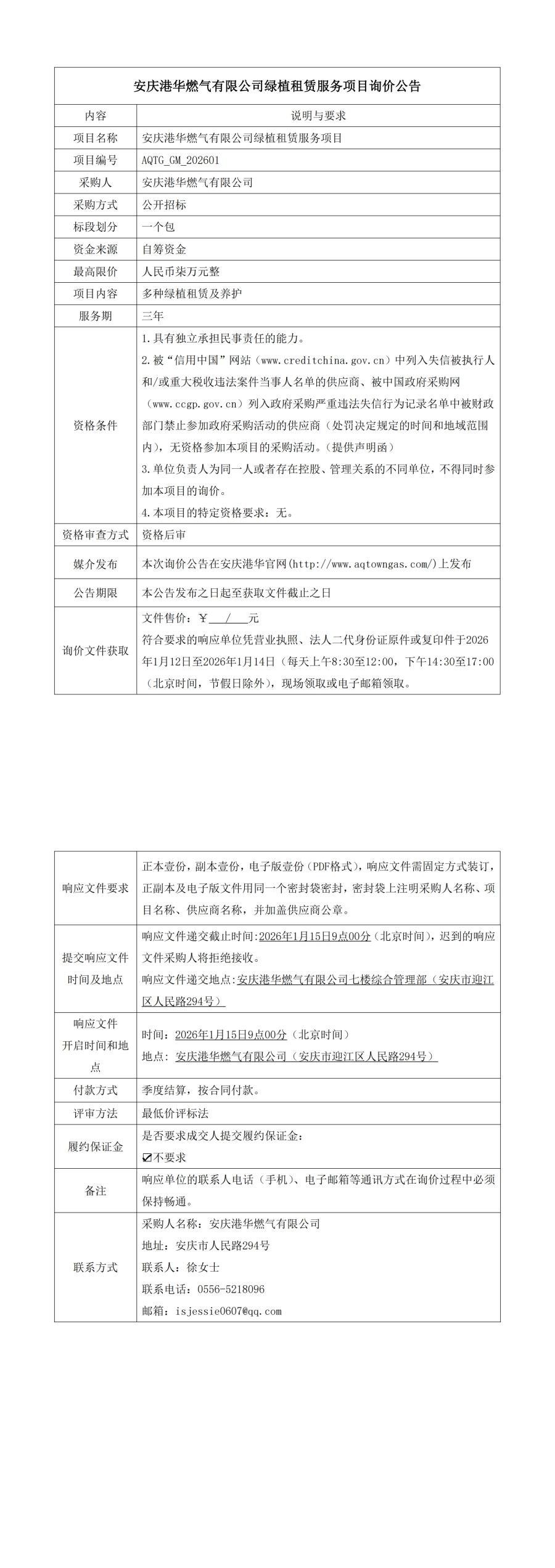 安慶港華燃?xì)庥邢薰揪G植租賃服務(wù)項(xiàng)目詢價(jià)公告 發(fā)布時(shí)間:2026-01-12    閱讀次數(shù):319次